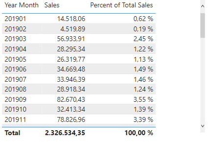 I want a table displaying sales by Year/Month and also the percentage of total sales.