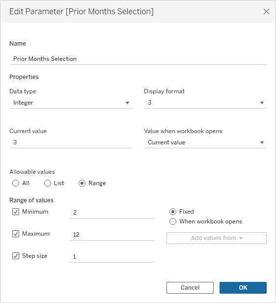 In Tableau i created a parameter with Data Type integer and a range from 2 to 12.