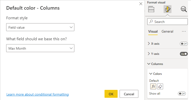 To apply the color values to the column, i used the Max Month field for conditional formatting