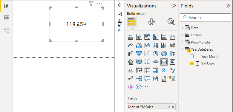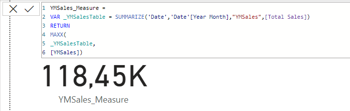 I actually don’t even need to create the table separately. I can use it as a table expression within a MAXX function to calculate a measure with the maximum YM sales value.