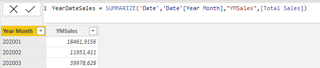 For what Tableau creates in the background with the LOD, I need to create a table in Power BI, that gives me the Sales amount by YM using the SUMMARIZE function.