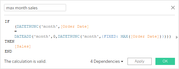 This calculation checks for each month if it is equal to the month of the maximum Order Date.