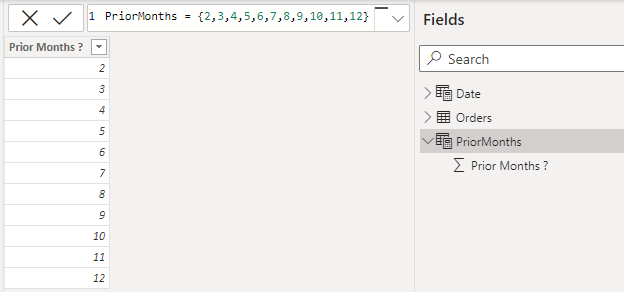 As we do not want to include the latest month, I set the end to -1. The start value will be changed later to enable the selection of the prior X months.