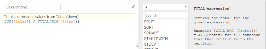 I could have also created the Percent of Total calculation easily by myself. For the total, Tableau already provides an expression.